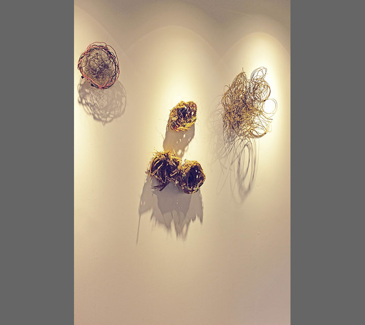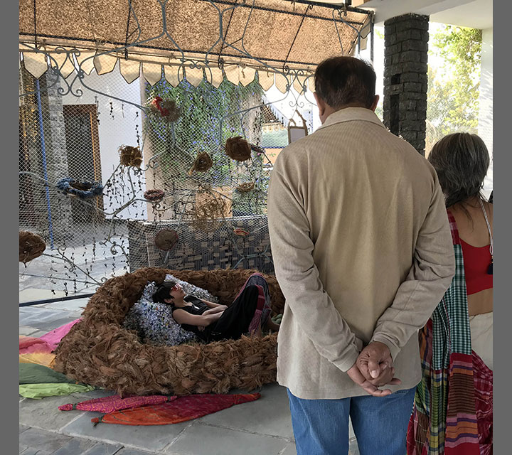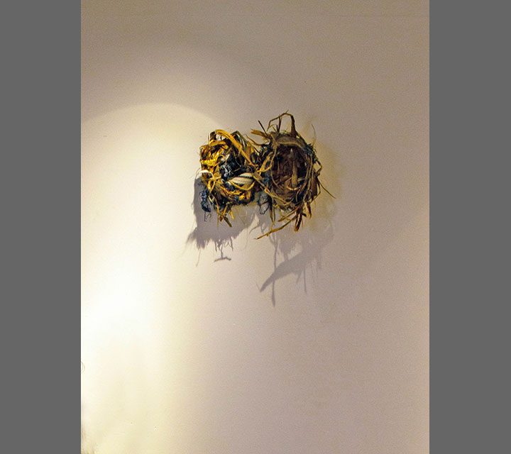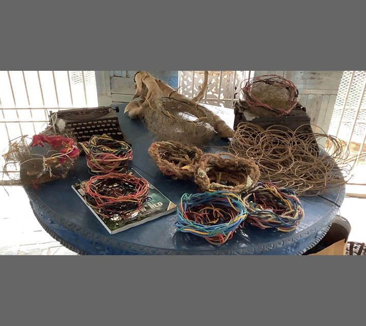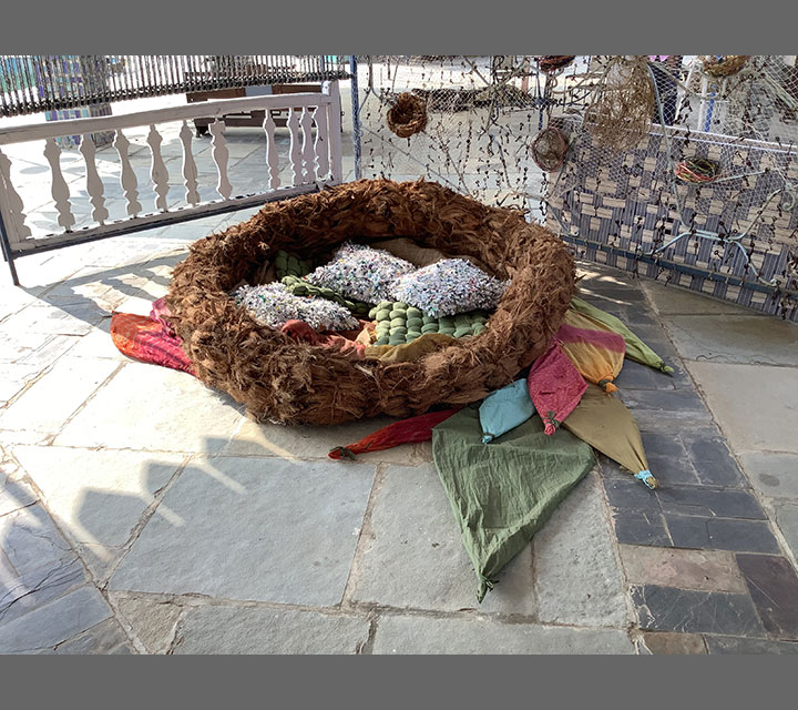 These nests represent the Indian craft of weaving and an art form that birds do instinctively. They represent nurturing, security, a home. As we must weave our lives together through support, care, and inclusiveness, we have an opportunity to learn from these nests. We must observe the resourcefulness of the birds, and use found materials, whether inside of us or outside in the world, to create a quality of life for each other.