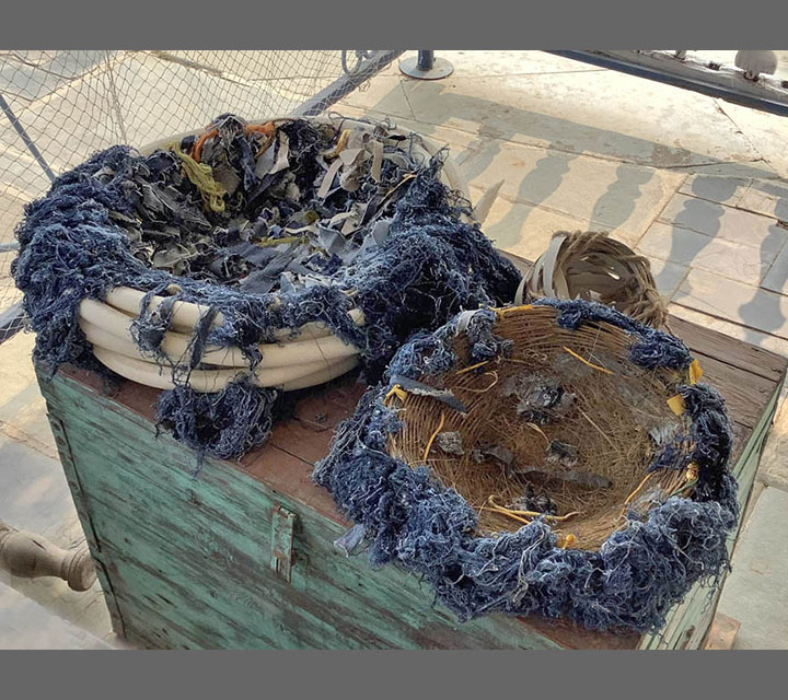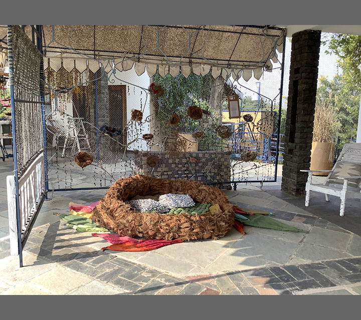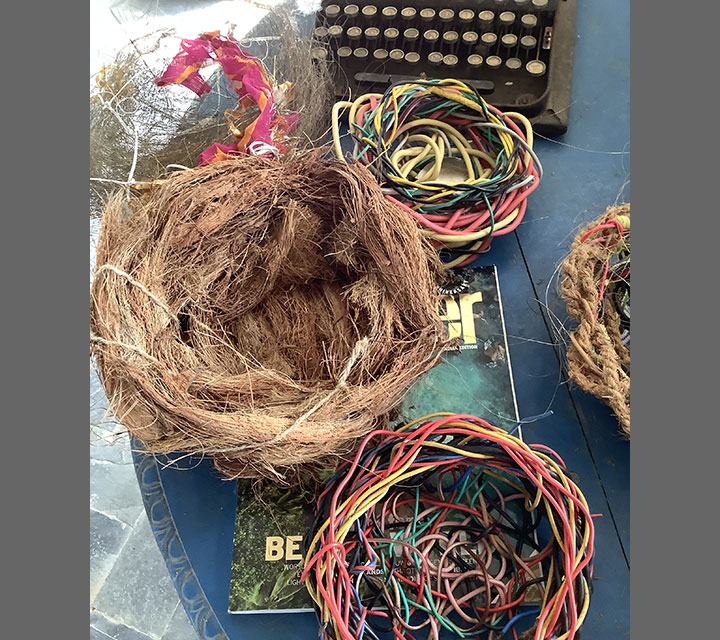 Weaving the Nest of Our Story, found materials such as wire, coconut husks, denim scraps, reeds, and rope, 2019