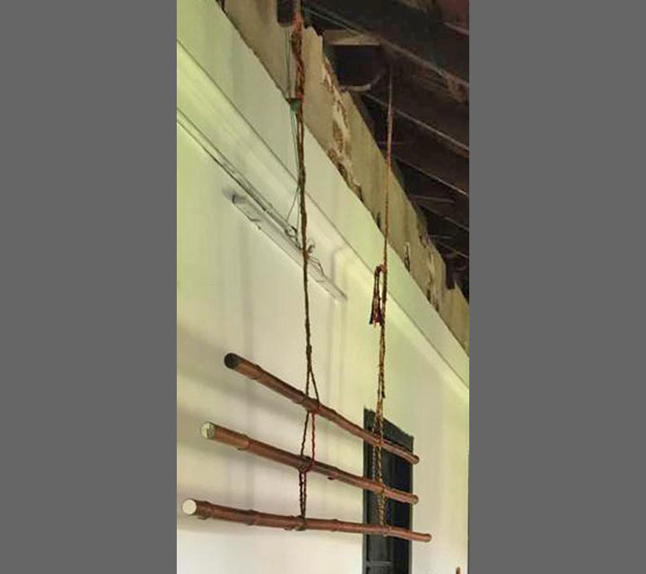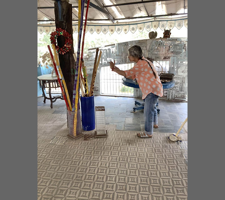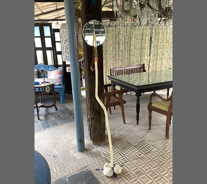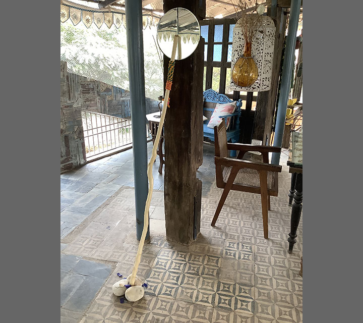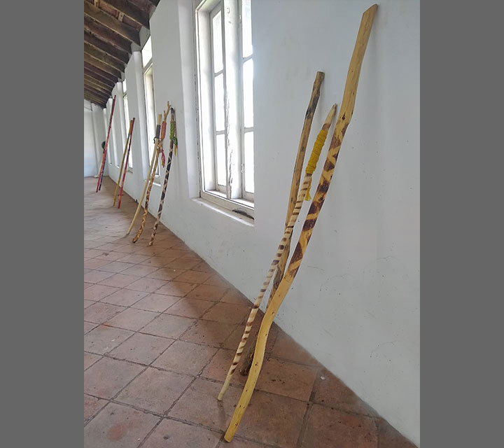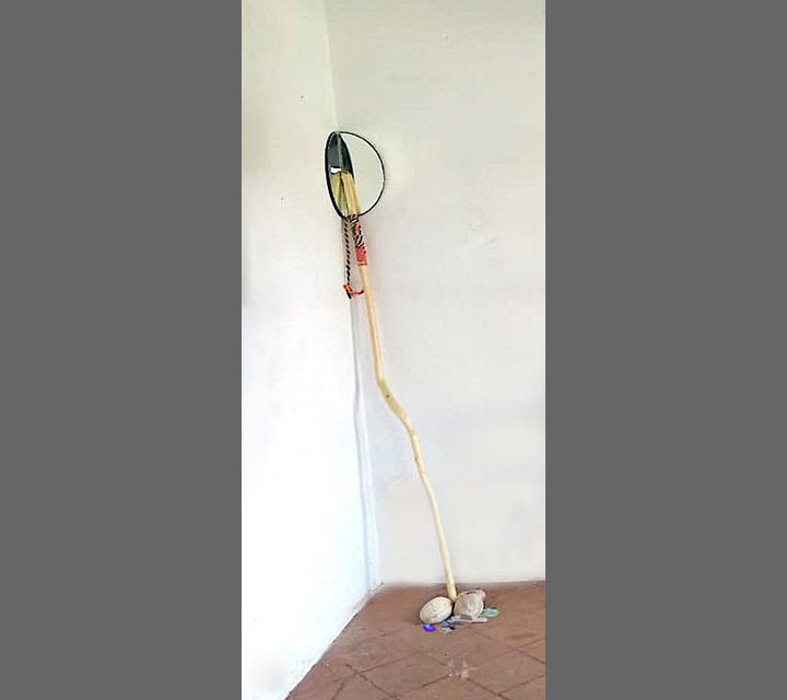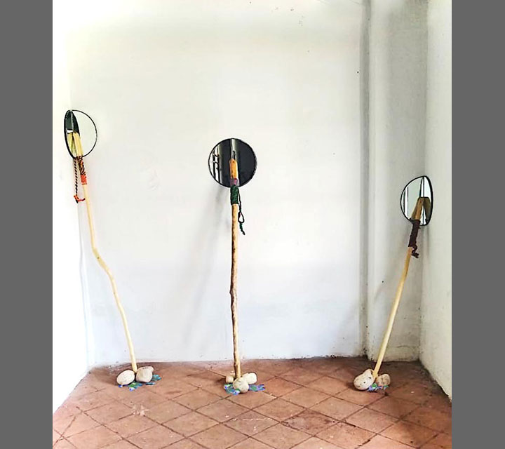 The walking sticks are presented in threes and multiples of three. They represent, youth, middle age, and elder adults. All three stages are represented by size. They provide balance as the need arises for making choices relevant to the phase or moment in one's life. The mirrors reflect each one of us and represent the mind. The stick is placed against the mirror to support our thoughts.