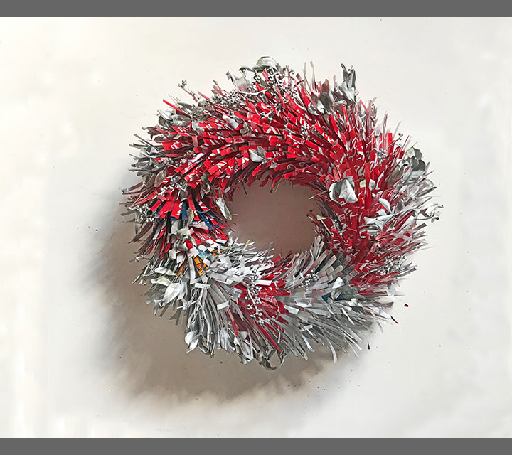 Every Cloud has a Silver Lining, repurposed and recycled materials: aluminum cans, wire coat hanger, and bayberry branches sprayed with metallic paint, 19" x 19"