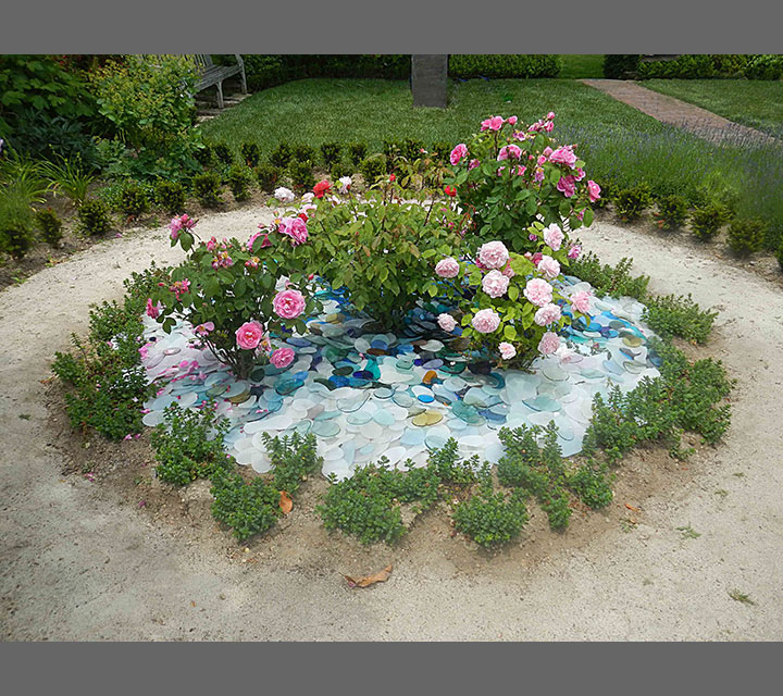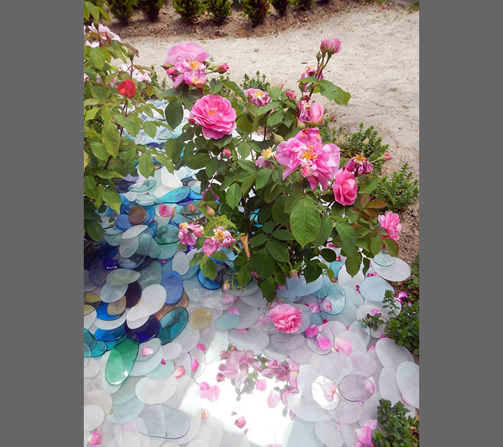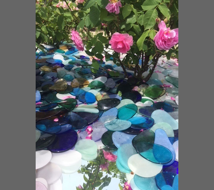 At a time when our country is polarized the inspiration for this installation is unity. Each piece of glass is made individually. There are no two shapes that are alike or the same size. However, there is a pattern to the shapes so they interact with each other. Each piece of glass in the installation intermingles color and shape to create harmony. As the sun moves from east to west and the weather changes, the shapes are unified and reflect the changes of light and mood.